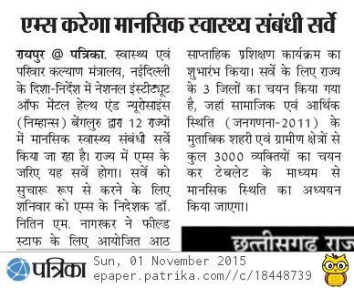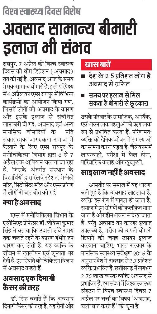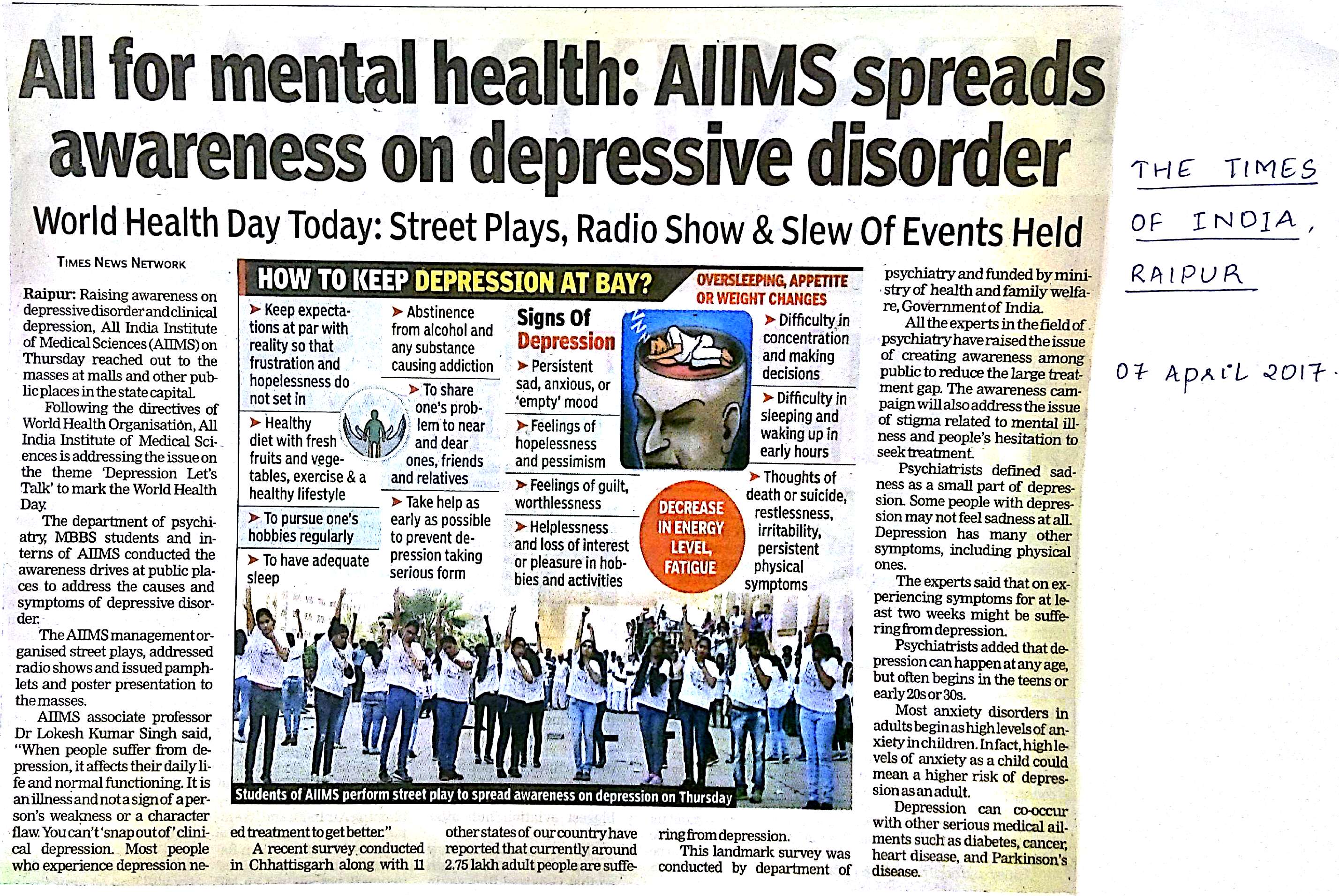 Briefing about activities related to National Mental Health Survey was given. Other events conducted by institute on the occasion of World Health Day was also told. The findings from state data on depression was also shared and emphasis was given on the ways to tackle depression. The issue of large treatment gap was discussed with media and need for awareness about depression among general public was suggested to overcome the treatment barrier. Newspapers had given importance by giving a good coverage of activities.