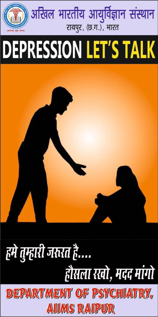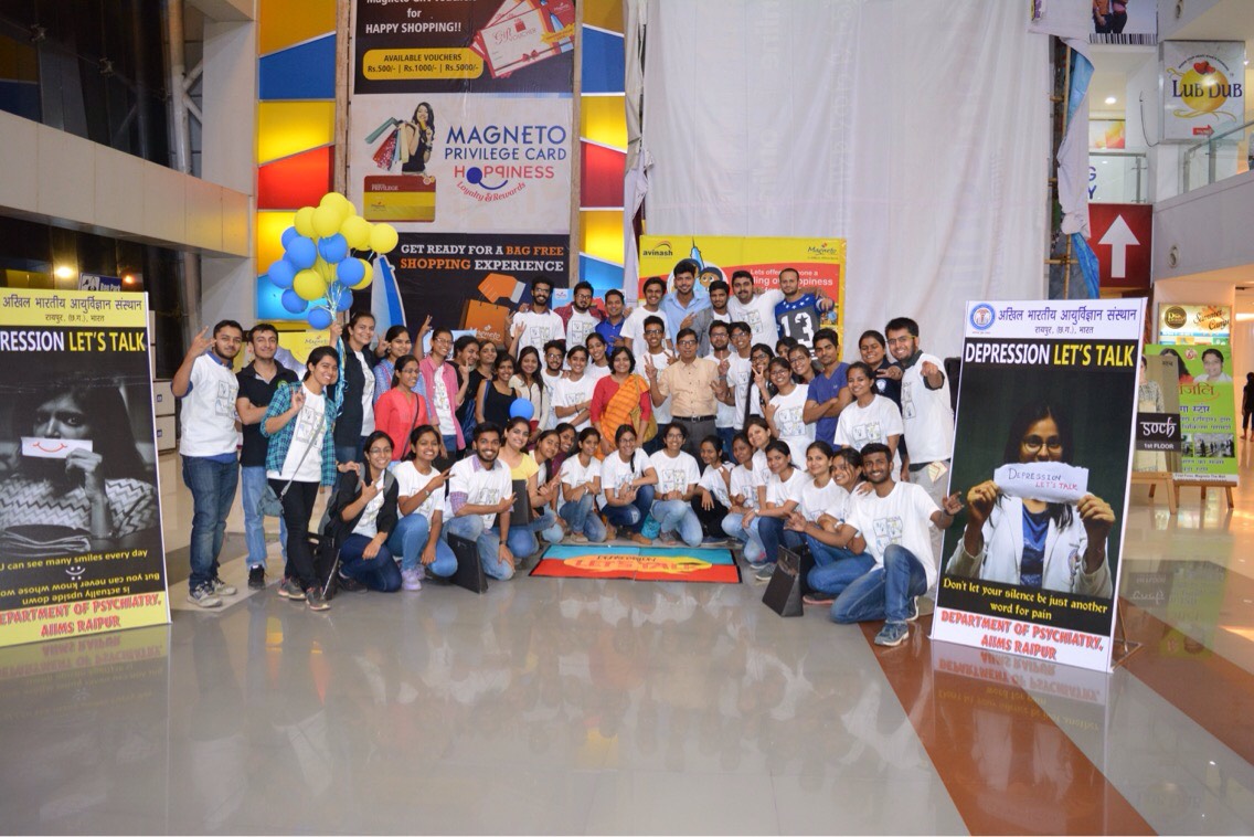 An awareness raising flash mob by students and interns of AIIMS, Raipur to draw attention to the number of people living with depression in India. Specially designed pamphlets were distributed among general public in OPD of AIIMS Raipur as well as public in the crowd gathered for awareness event in various places of the city. The awareness events are organized on following dates and places- Date-06/04/2017 – 1. Venue- OPD Area, AIIMS, Raipur Time- 9-10 AM 2. Venue- Magneto Mall, Raipur Time- 7- 8 PM Date-07/04/2017 – 1. Venue- Railway Station, Raipur Time- 5:30-6:30 PM 2. Venue- City Center mall, Raipur Time- 7:30-8:30 PM.
