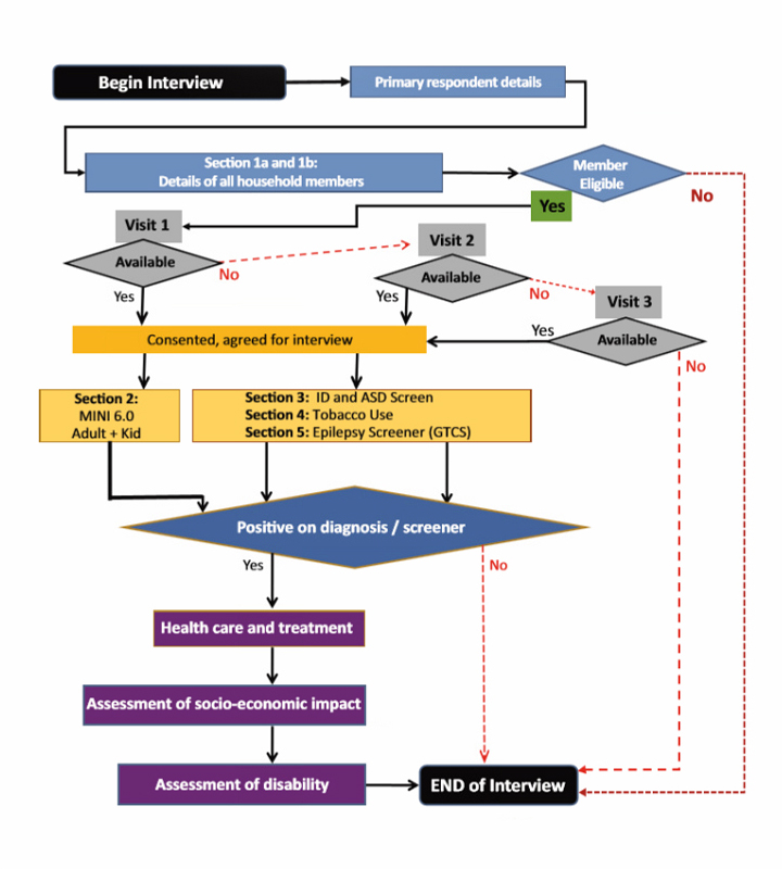 The study instruments collected sociodemographic information including completed age, gender, education, occupation, income (house-hold and individual) and marital status. For assessment of mental morbidity, the Mini International Neuro-Psychiatric Inventory (MINI) adult version and the MINI-Kid version were used for adults and, older children and adolescents, respectively. In addition, additional questionnaires for tobacco use (Fagerstrom questionnaire) and to screen for Epilepsy, Intellectual Disability (ID) and Autism Spectrum Disorders (ASD) were also incorporated. Further, questionnaires on health care utilisation, assessment of disability (modified Sheehan’s scale) and socioeconomic impact of illness were used in the study. All data collection instruments were translated into the local languages of each of the surveyed states. Translated MINI instruments which were already available along with the other translated instruments were checked for social and cultural appropriateness, back -translated and then appropriate changes made for the final versions, which were then field-tested before use.