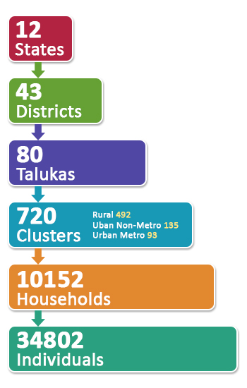 A multi stage sampling was adopted in each state and each selected state of India constituted the sampling frame. The districts and talukas within the states constituted the Primary and Secondary Sampling Units, respectively. Each named inhabited village as per the Census 2011 constituted a rural cluster, while a census enumeration block represented an urban cluster and individuals within the identified households formed the unit of analysis. The numbers of rural, urban metro and urban non-metro clusters were selected based on their respective proportions for the state. Within each cluster all eligible members (>=18 years) within the households selected using systematic random sampling method were interviewed. Thus, in total 34802 adults and about 1191 adolescents drawn from 12 states were interviewed.