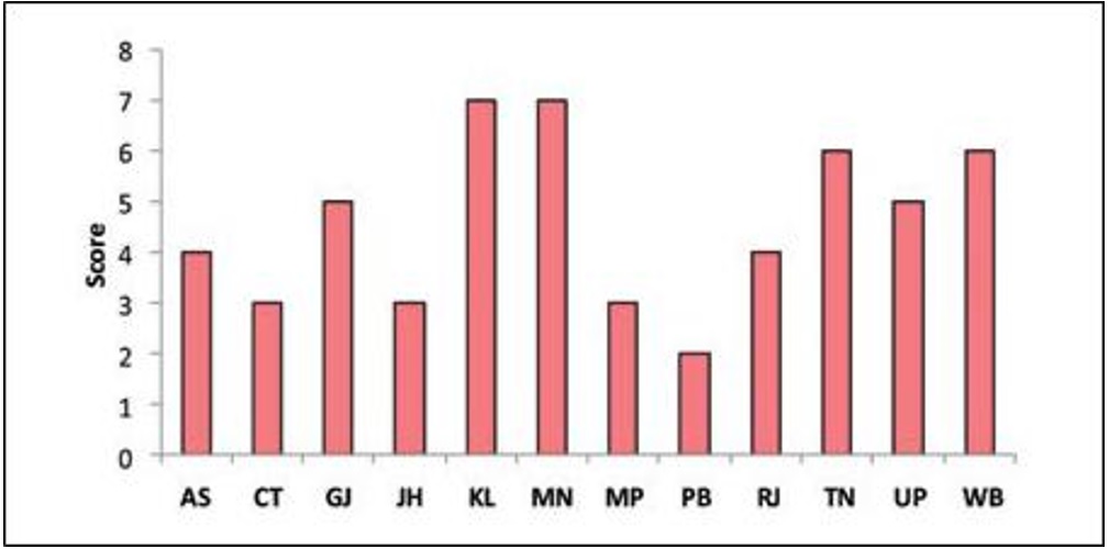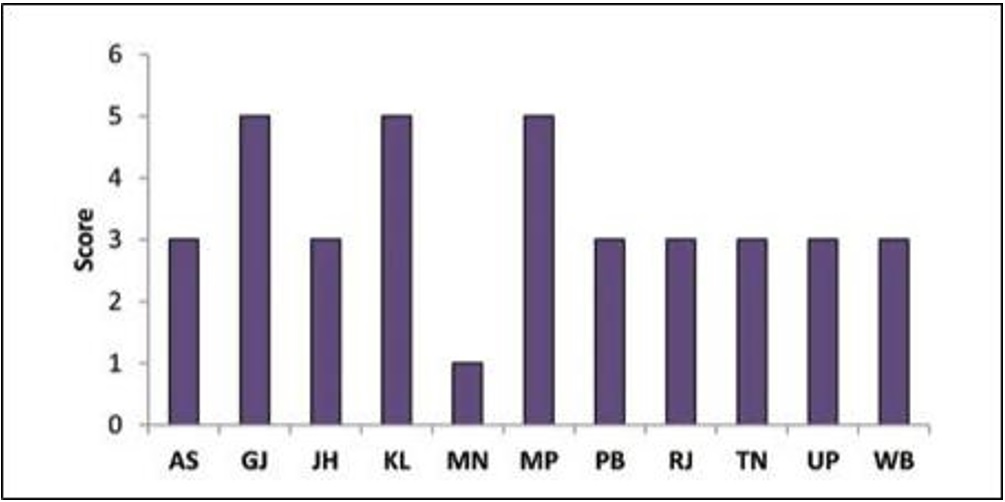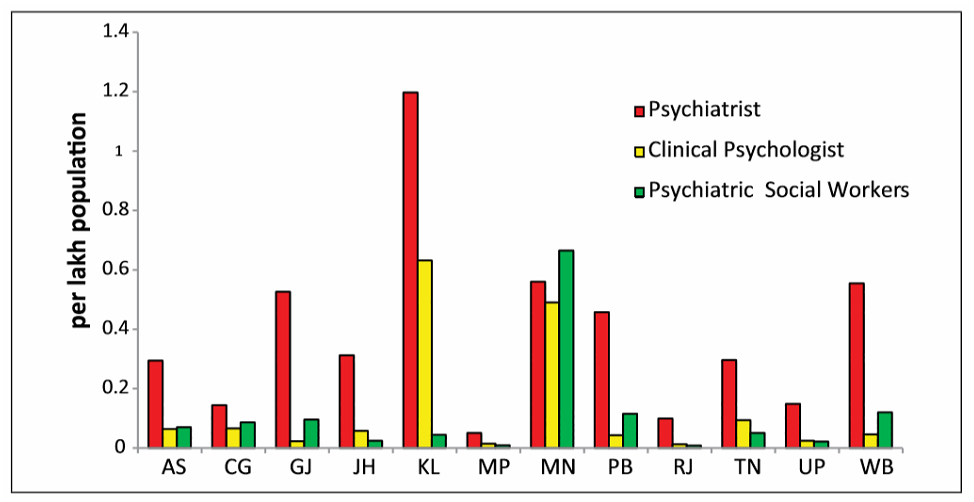 The number of medical officers at the state and district levels trained to deliver mental health services (per lakh population) ranged from 0.1 in Jharkhand and Madhya Pradesh to 0.1 in Uttar Pradesh and 9.73 in Manipur. This is a reflection of progress or rather the lack of it, towards the integration of mental health service delivery in Primary care. Information on rehabilitation workers, special education teachers and paraprofessional counselors was not available. Wherever available, it was found to be grossly inadequate to meet the current needs.