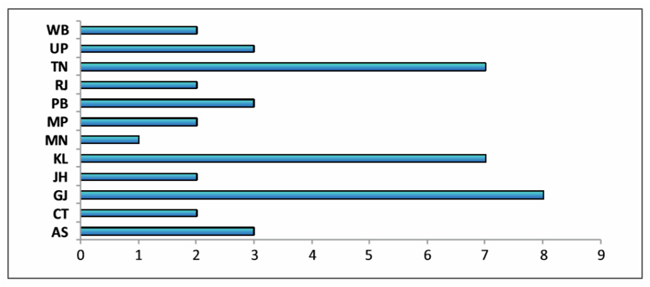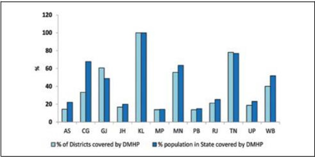 As far as training institutions in mental health were concerned, Tamil Nadu had the maximum number of institutions (19) providing a postgraduate course in psychiatry followed by Kerala (15) and Uttar Pradesh (12). The yearly intake across institutions in the NMHS states ranged from nil to 52 per year.